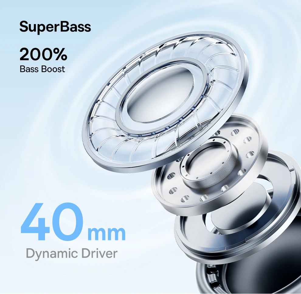 1. Super Bass imersivo: experimente graves profundos e socos com drivers dinâmicos de 40 mm e tecnologia SuperBass para aumento de graves de 200%.De graves agitados a agudos cristalinos, cada nota atinge cada nota perfeitamente para um som rico e natural.E o algoritmo de áudio espacial oferece uma experiência de áudio envolvente semelhante ao de um teatro.